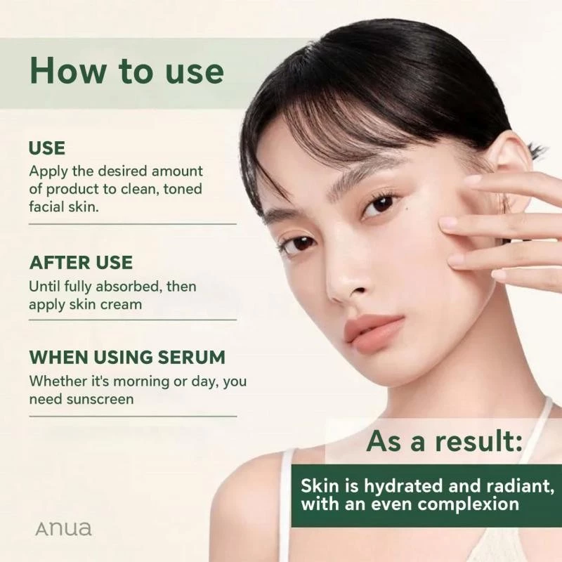 Apply a small amount of serum to clean skin after toner and/or essence. Let it absorb for a moment, then finish with a moisturizer.
