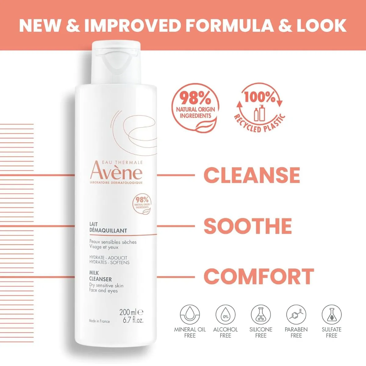 Formulation: Alcohol-free, mild surfactants, high content of Avène Thermal Spring Water, no animal ingredients