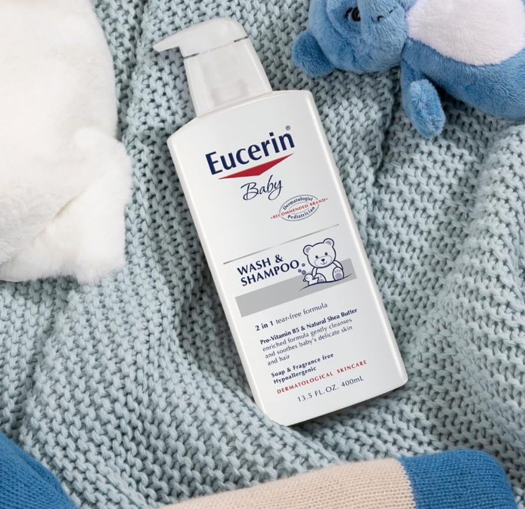 Eucerin® Baby Wash & Shampoo – a gentle formula that cleanses baby’s delicate skin and hair without drying.